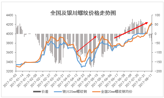 傳統需求淡季接近尾聲,而“淡季不淡”的言論也得到了市場的證實。全國螺紋鋼價格自6月初3740元/噸上漲至4230元/噸,漲幅接近500元/噸,漲幅達13.4%。而銀川區域螺紋鋼價格也隨之水漲船高,由6月初3650元/噸一路上行至接近4200元/噸,漲幅達550元/噸,漲幅約15.07%。但上周五,中鋼協明確表態,控制鋼價漲幅,擠壓市場泡沫,隨后螺紋主力合約沖高回落,鋼坯價格亦隨之大幅下挫,鋼市開始瘋漲之后的平靜,拋貨套現者不在少數。那么在宏觀政策調控下的遠期市場走弱及鋼坯價格的大幅下跌的影響下,短期內市場價格如何走向,筆者將以銀川建筑鋼材現狀及后期走勢做簡單預判。